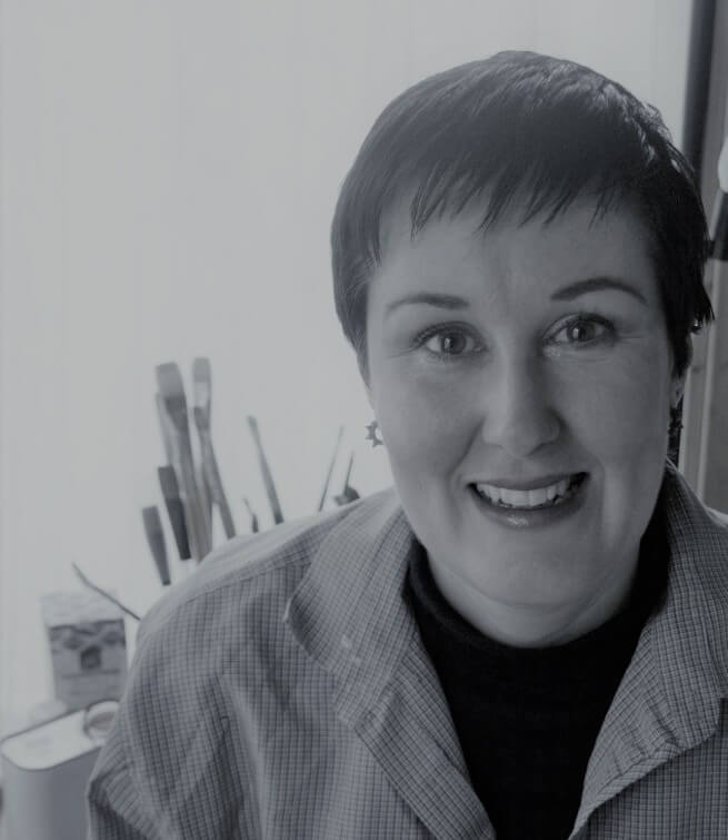 She loves to work with acrylics due to their vibrance and quick-drying nature which allow her to become really engrossed in her work for long periods and to paint clean detail with real focus.